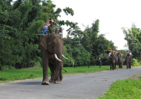 Khách du lịch tham quan, cưỡi voi ở huyện Lắk.