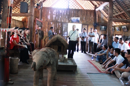 Hướng dẫn viên tại Trung tâm du lịch Buôn Đôn đang giới thiệu về văn hóa, phong tục tập quán của đồng bào dân tộc bản địa với du khách