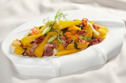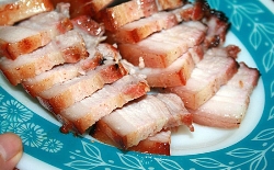 Từ những nguyên liệu quen thuộc nhưng lại tạo ra vị ngon rất mới lạ và hấp dẫn! Món ăn có vị ngọt bùi và thơm của bí đỏ, thịt xông khói giòn, mùi thơm của tía tô và mè rang quyện lại thật hấp dẫn!