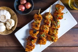 Một món chay hấp dẫn lạ thường với Cà tím áp chảo xốt cay. Miếng cà vàng đều, thơm lừng mùi boa-rô phi, hòa cùng các loại rau củ như nấm rơm, nấm hương khô, cà rốt…