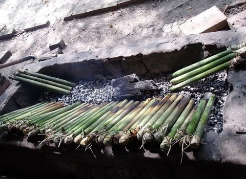 Bà con các dân tộc Tây Nguyên còn có một món cơm rất ngon là cơm nướng (hay còn gọi là cơm lam). Gạo được bỏ vào ống tre, ống nứa, lấy nước suối để nấu. Những ống nứa ấy được đốt trên lửa hoặc vùi trong than, dậm đà hương vị thiên nhiên. Khi cơm chín, người ta chẻ bỏ lớp cháy bên ngoài, lộ ra phần ruột trắng ngần. Khi ăn, xắt ra thành từng miếng chấm với muối vừng, cho ta một hương vị rất riêng.