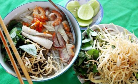 -Bún sắp vào tô, rồi tới tôm, cá lóc, heo quay, hẹ, rồi chan nước dùng lên, ăn với rau đã chuẩn bị, nhớ thêm chanh ớt.