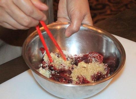 Thịt bò mua về rửa sạch rồi thái miếng dày khoảng 0,5cm. Sau đó xếp từng miếng vào khay sạch.