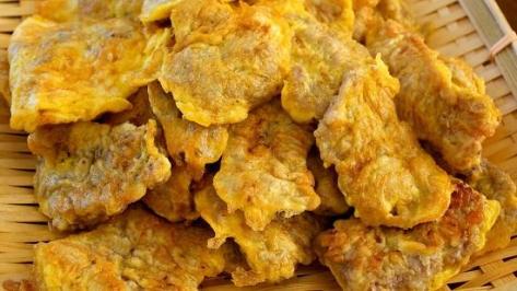 Bắc chảo lên bếp, cho dầu ăn vào đun sôi. Sau đó nhúng từng miếng thịt bò qua hỗn hợp trứng rồi cho vào chảo chiên.