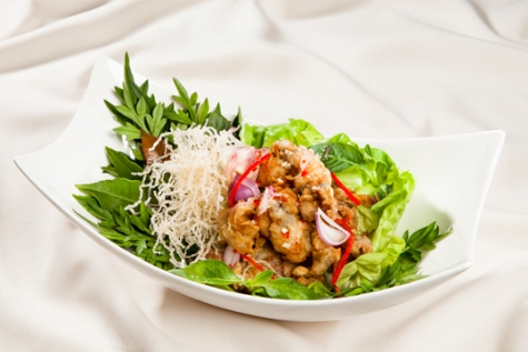 – Xếp lần lượt xà lách, rau rừng, hành tây tím, thịt ếch chiên, sau đó rưới nước trộn gỏi lên. Rắc hành phi và đậu phộng lên trên cùng. Trộn đều trước khi dùng.
