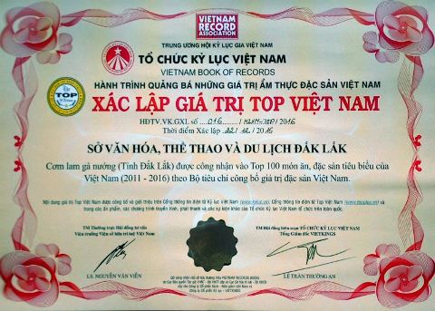 Ngày 06/5/2017, tại Tp. Hồ Chí Minh, Hội Kỷ lục gia Việt Nam đã tổ chức trao Bằng chứng nhận Top 100 món ngon việt Nam, trong đó có cơm lam, gà nướng Đắk Lắk. Được biết, những món ngon này sẽ được giới thiệu, quảng bá đến bạn bè quốc tế thông qua những hội chợ, tour du lịch ẩm thực Việt Nam trong và ngoài nước.