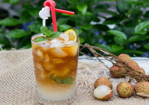 – Lấy 1 lượng nước vải ngâm, lấy thêm vài quả vải ngâm cho vào ly, thêm 1 ít đá viên rồi rót trà lipton vào, bạn có thể tùy chỉnh độ ngọt theo sở thích.