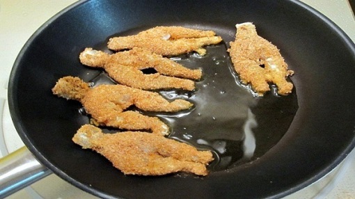 Cho thịt ếch đã nhúng trứng và lăn qua bột vào chảo rán vàng