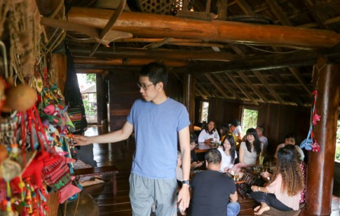 Chủ quán cà phê Arul, buôn Akô Dhông (TP. Buôn Ma Thuột) giới thiệu với du khách về nét độc đáo của văn hóa Êđê. Ảnh: H. Gia