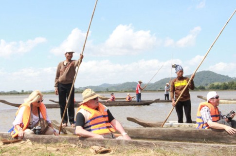 Người dân buôn Jun, thị trấn Liên Sơn (huyện Lắk) chuẩn bị chèo thuyền độc mộc phục vụ du khách. Ảnh: L.Anh