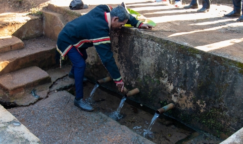 Thầy cúng đưa bát rượu cần lên đầu các vòi xin thần nước ban cho dòng nước trong lành