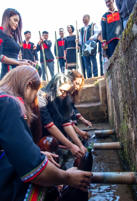 Thầy cúng thực hiện các nghi thức cúng tại bến nước và đọc lời khấn mong các vị thần phù hộ cho nguồn nước trong lành, không bao giờ cạn, mọi người trong buôn uống dòng nước này đều mạnh khỏe… Sau nghi thức cúng, các cô gái Ê Đê hứng từng bầu nước đầy tràn, gùi về buôn.