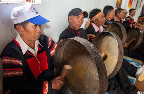 Trong nhà cộng đồng, các nghệ nhân đánh những bài chiêng truyền thống