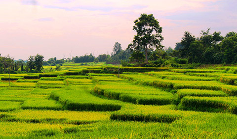 Hoàng hôn nhạt đáp xuống mặt ruộng bậc thang ở buôn Húk B (xã cư Mgar, huyện Cư Mgar, Đắk Lắk) được bà con cải tạo chạy dài theo triền đồi nhấp nhô, uốn lượn, uyển chuyển theo những cung bậc của núi đồi nơi đây. Ông Y Cương Niê, người dân buôn Húk B cho biết: “Ở đây bà con mỗi năm thường làm 2 vụ lúa nước trên ruộng bậc thang. Buôn tôi thường tập trung cấy lúa ngay khi mùa mưa bắt đầu, lúc các con suối đã có nước dẫn về ruộng”. Ruộng bậc thang ở các địa phương trên Tây Nguyên bắt đầu hình thành cách đây hơn 20 năm, do bà con dân tộc Mông, Tày, Nùng di cư từ các tỉnh miền núi phía Bắc vào khai hoang, cải tạo những quả đồi dốc thành những thửa ruộng bậc thang đẹp mắt, mở rộng diện tích sản xuất lúa nước. Dần dần, các dân tộc bản địa học hỏi, cải tạo đất đồi thành ruộng bậc thang ngày càng nhiều.